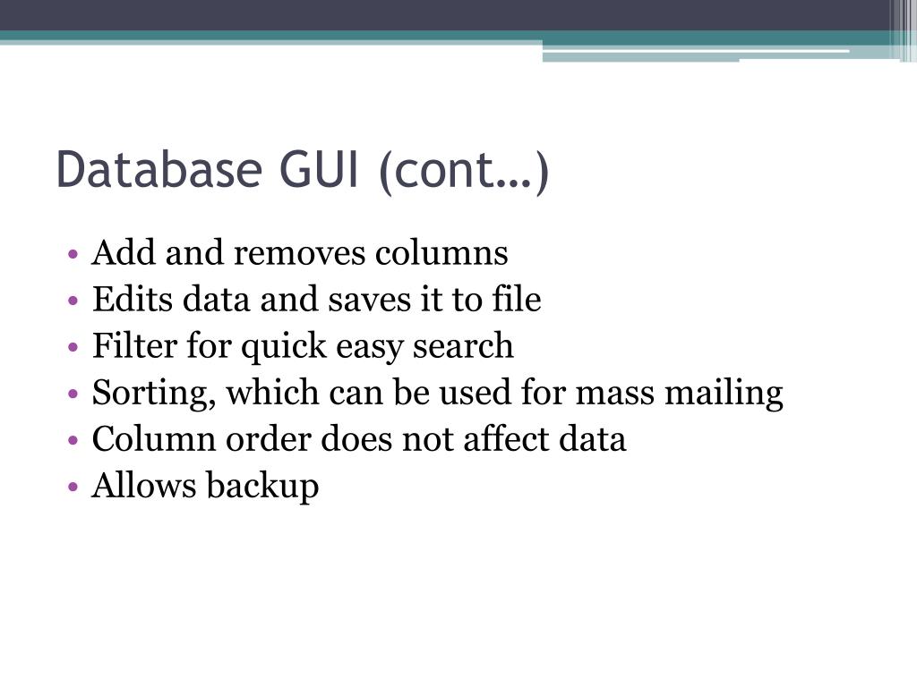 Database GUI (cont…) • Add and removes columns • Edits data and saves it to file • Filter for quick easy search • Sorting, which can be used for mass mailing • Column order does not affect data • Allows backup