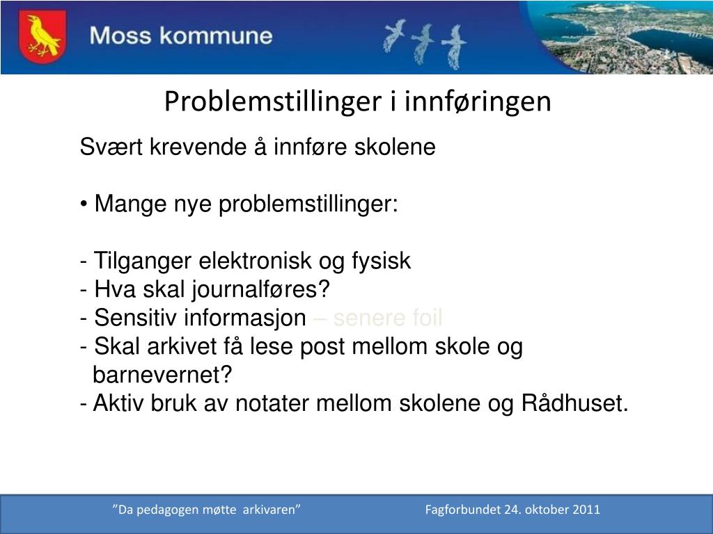 Bakgrunn for arbeidet i Moss kommune • Vi innførte elektronisk arkivsytem i 2006, for de som var i et arkivsystem fra før. • Skolene var ikke med. • Det var spørsmål rundt elevmapper. ”Da pedagogen møtte arkivaren” Fagforbundet 24. oktober 2011
