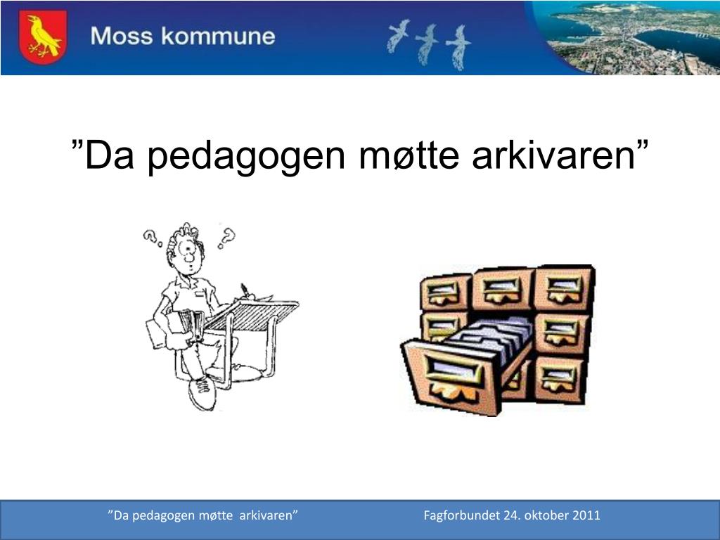 Spørsmål? Ta kontakt med Moss kommune Rita Lynghaug, Arkivleder tlf 41 51 58 66 - rita.lynghaug@moss.kommune.no Kontaktperson IT: Jon Olsen, Ikt veileder 48 18 00 81 - jon.olsen@moss.kommune.no ”Da pedagogen møtte arkivaren” Fagforbundet 24. oktober 2011