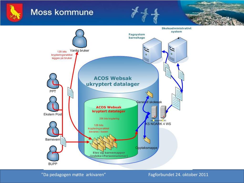 Hva med sensitiv informasjon? • Digital arkivering trigger en rekke spørsmål om sikkerhet og behandling av sensitiv info. • Presentert for Acos krypteringsmodul. • Gjennomført risikoanalyse som viser at det var fornuftig. ”Da pedagogen møtte arkivaren” Fagforbundet 24. oktober 2011