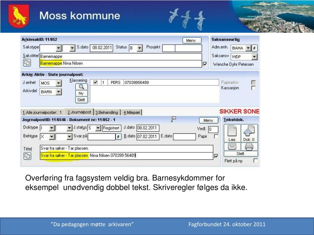 Overføring fra fagsystem veldig bra. Barnesykdommer for eksempel unødvendig dobbel tekst. Skriveregler følges da ikke. ”Da pedagogen møtte arkivaren” Fagforbundet 24. oktober 2011