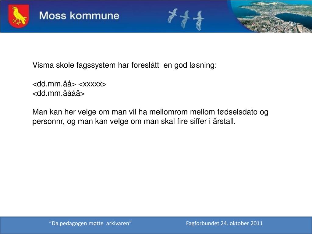 Visma skole fagssystem har foreslått en god løsning: <dd.mm.åå> <xxxxx> <dd.mm.åååå> Man kan her velge om man vil ha mellomrom mellom fødselsdato og personnr, og man kan velge om man skal fire siffer i årstall. ”Da pedagogen møtte arkivaren” Fagforbundet 24. oktober 2011