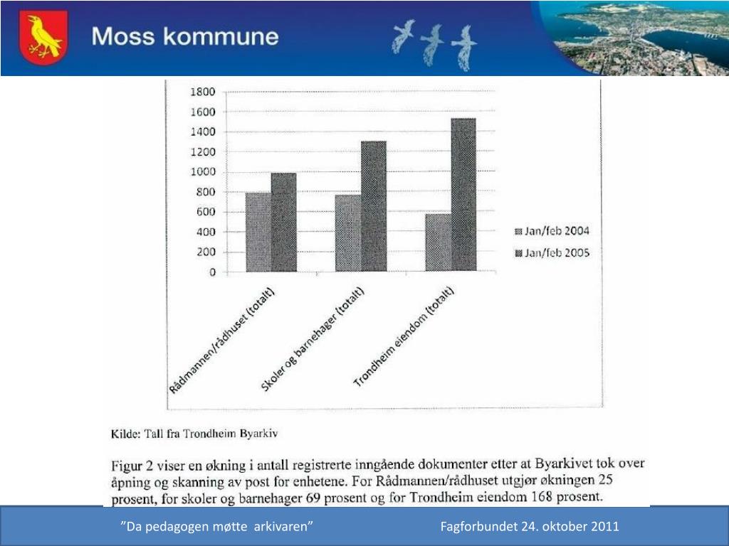 Forts...Post inn via arkivets postmottak • Postombringing uten bud har gått veldig greit. • Arkivverdig post får de opp på skjermen. Reklame osv hentes 1-2 ganger i uka på Rådhuset. Samtidig som post leveres ned. Skolene har frimerker for hasteutsendelser. • Søknad om fri har vi bedt sendes via post@moss.kommune.no ”Da pedagogen møtte arkivaren” Fagforbundet 24. oktober 2011