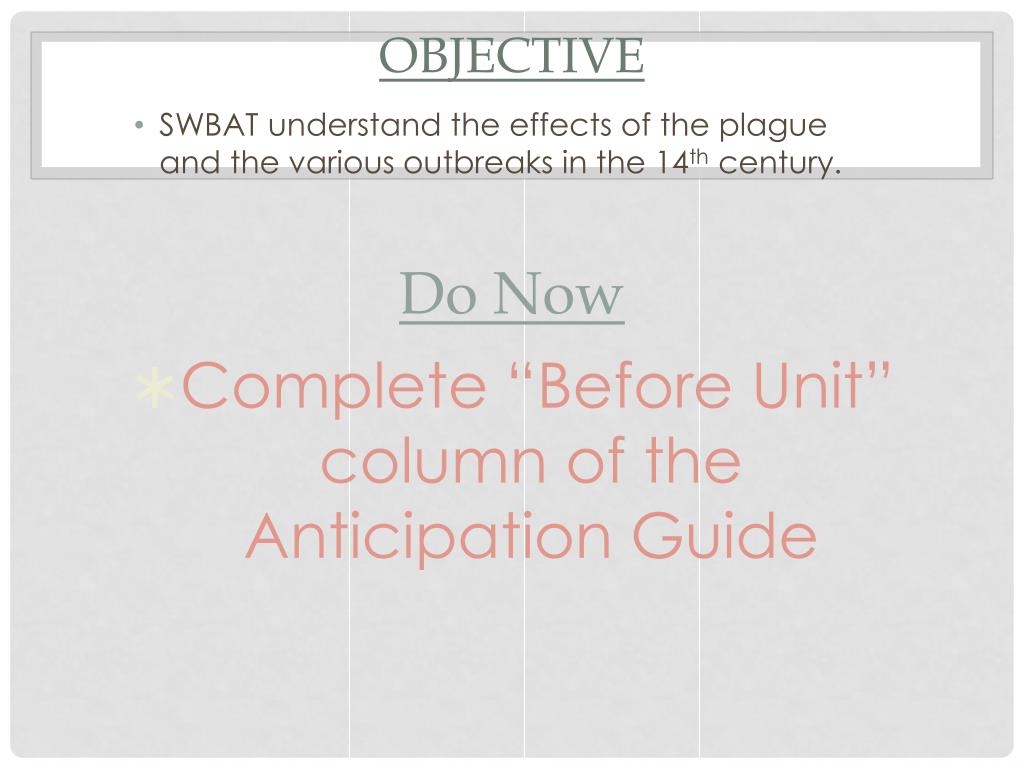 Objective • SWBAT understand the effects of the plague and the various outbreaks in the 14th century. Do Now • Complete “Before Unit” column of the Anticipation Guide