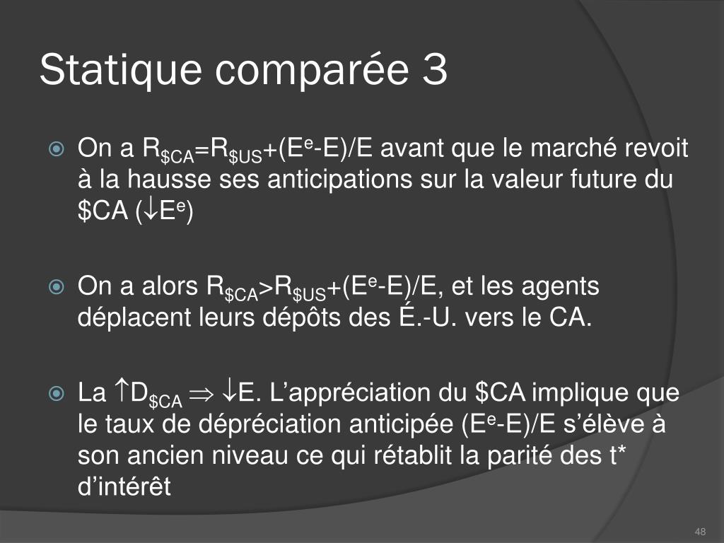 Statique comparée 1 • R$CA=R$US+(Ee-E)/E avant que la BC annonce une R$CA • On a alors R$CA>R$US+(Ee-E)/E : les agents déplacent leurs dépôts des É.-U. vers le CA. • La D$CA E. L’appréciation du $CA fait que le taux de dépréciation anticipée du $CA, (Ee-E)/E, augmente ce qui rétablit la parité des t* d’intérêt