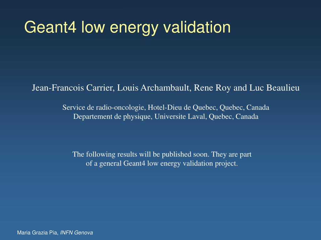 Geant4 low energy validation Jean-Francois Carrier, Louis Archambault, Rene Roy and Luc Beaulieu Service de radio-oncologie, Hotel-Dieu de Quebec, Quebec, Canada Departement de physique, Universite Laval, Quebec, Canada The following results will be published soon. They are part of a general Geant4 low energy validation project.