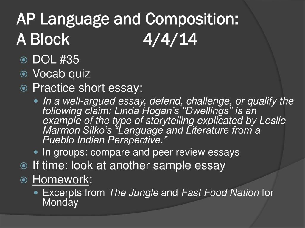 AP Language and Composition: A Block 4/4/14 • DOL #35 • Vocab quiz • Practice short essay: • In a well-argued essay, defend, challenge, or qualify the following claim: Linda Hogan’s “Dwellings” is an example of the type of storytelling explicated by Leslie Marmon Silko’s “Language and Literature from a Pueblo Indian Perspective.” • In groups: compare and peer review essays • If time: look at another sample essay • Homework: • Excerpts from The Jungle and Fast Food Nation for Monday