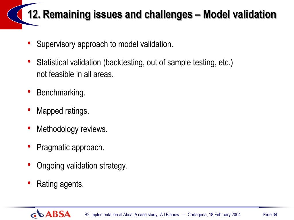 12. Remaining issues and challenges – Model validation • Supervisory approach to model validation. • Statistical validation (backtesting, out of sample testing, etc.) not feasible in all areas. • Benchmarking. • Mapped ratings. • Methodology reviews. • Pragmatic approach. • Ongoing validation strategy. • Rating agents.