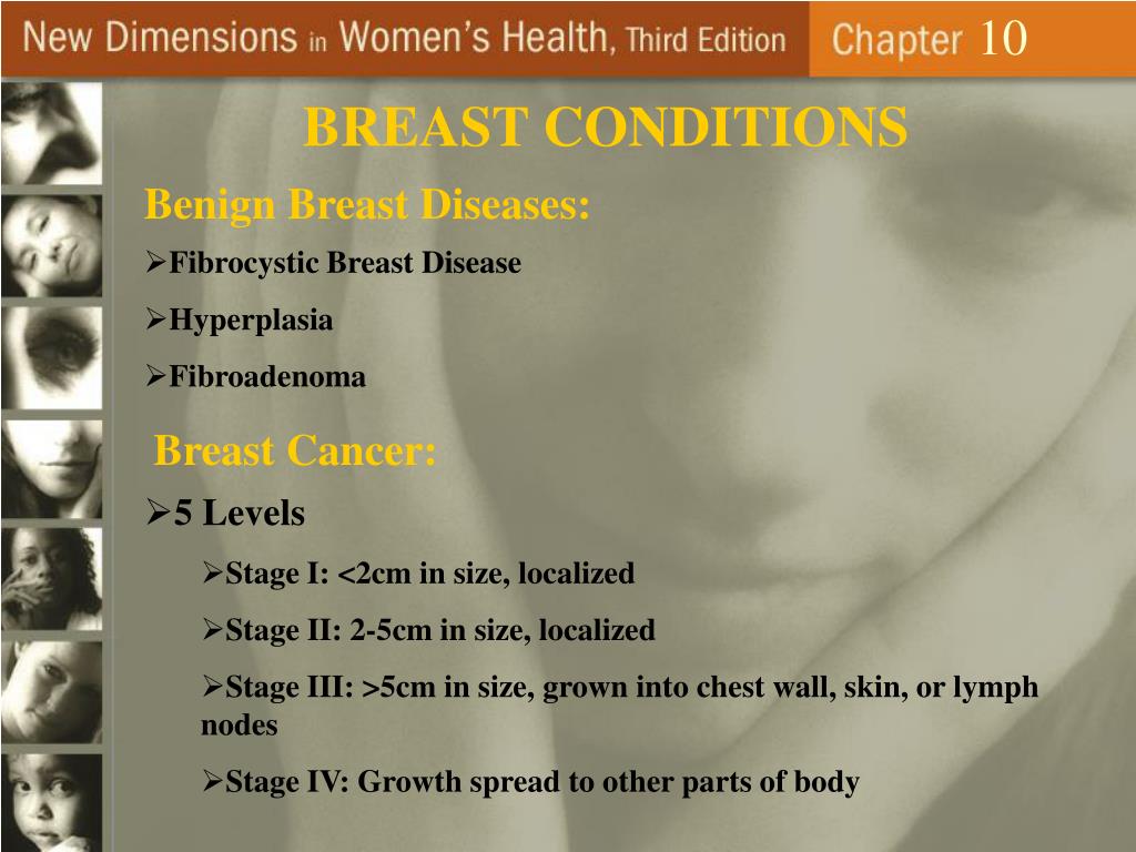 10 BREAST CONDITIONS Benign Breast Diseases: • Fibrocystic Breast Disease • Hyperplasia • Fibroadenoma Breast Cancer: • 5 Levels • Stage I: <2cm in size, localized • Stage II: 2-5cm in size, localized • Stage III: >5cm in size, grown into chest wall, skin, or lymph nodes • Stage IV: Growth spread to other parts of body