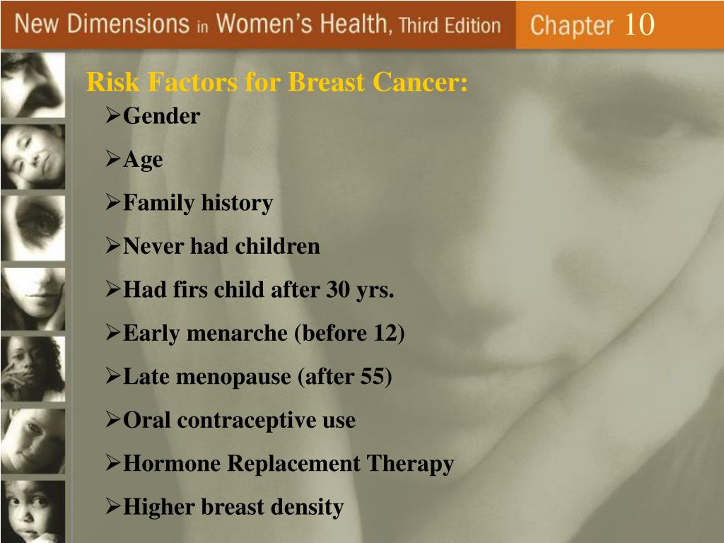 10 Risk Factors for Breast Cancer: • Gender • Age • Family history • Never had children • Had firs child after 30 yrs. • Early menarche (before 12) • Late menopause (after 55) • Oral contraceptive use • Hormone Replacement Therapy • Higher breast density