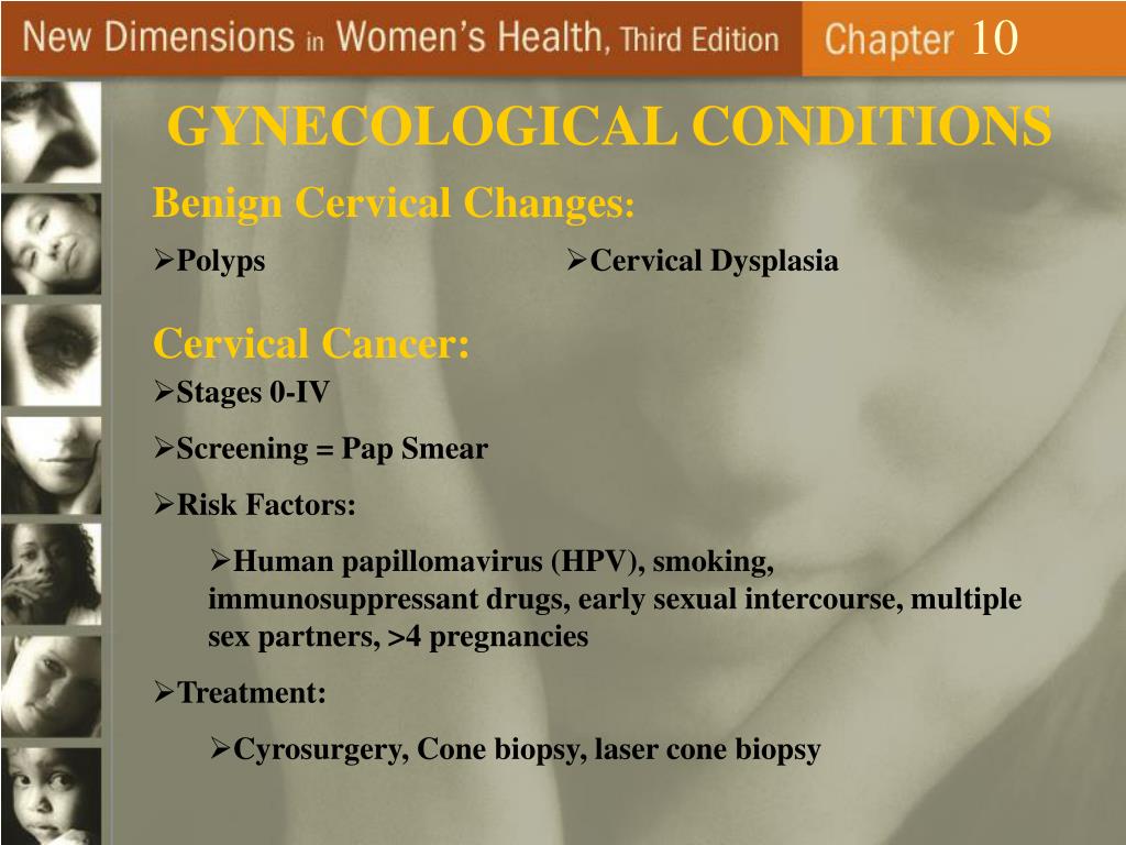 10 GYNECOLOGICAL CONDITIONS Benign Cervical Changes: • Polyps • Cervical Dysplasia Cervical Cancer: • Stages 0-IV • Screening = Pap Smear • Risk Factors: • Human papillomavirus (HPV), smoking, immunosuppressant drugs, early sexual intercourse, multiple sex partners, >4 pregnancies • Treatment: • Cyrosurgery, Cone biopsy, laser cone biopsy