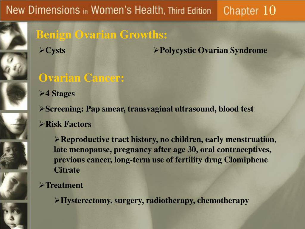 10 Benign Ovarian Growths: • Cysts • Polycystic Ovarian Syndrome Ovarian Cancer: • 4 Stages • Screening: Pap smear, transvaginal ultrasound, blood test • Risk Factors • Reproductive tract history, no children, early menstruation, late menopause, pregnancy after age 30, oral contraceptives, previous cancer, long-term use of fertility drug Clomiphene Citrate • Treatment • Hysterectomy, surgery, radiotherapy, chemotherapy