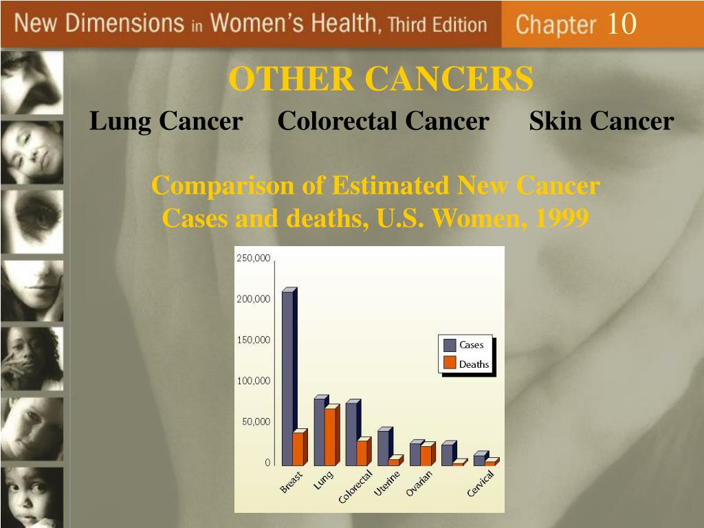 10 OTHER CANCERS Lung Cancer Colorectal Cancer Skin Cancer Comparison of Estimated New Cancer Cases and deaths, U.S. Women, 1999