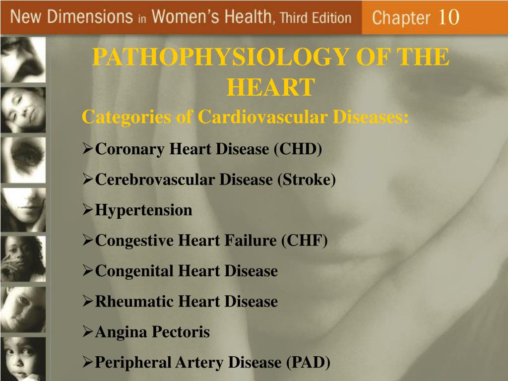 10 PATHOPHYSIOLOGY OF THE HEART • Categories of Cardiovascular Diseases: • Coronary Heart Disease (CHD) • Cerebrovascular Disease (Stroke) • Hypertension • Congestive Heart Failure (CHF) • Congenital Heart Disease • Rheumatic Heart Disease • Angina Pectoris • Peripheral Artery Disease (PAD)