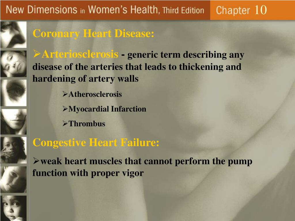 10 Coronary Heart Disease: • Arteriosclerosis -generic term describing any disease of the arteries that leads to thickening and hardening of artery walls • Atherosclerosis • Myocardial Infarction • Thrombus Congestive Heart Failure: • weak heart muscles that cannot perform the pump function with proper vigor