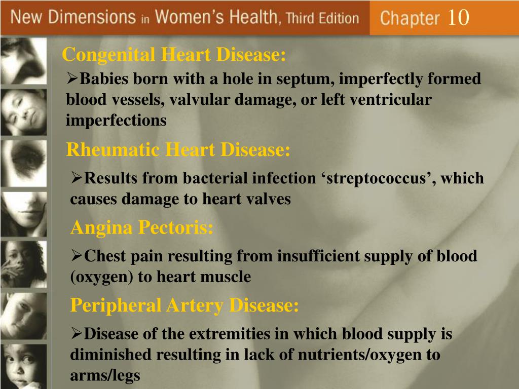 10 Congenital Heart Disease: • Babies born with a hole in septum, imperfectly formed blood vessels, valvular damage, or left ventricular imperfections Rheumatic Heart Disease: • Results from bacterial infection ‘streptococcus’, which causes damage to heart valves Angina Pectoris: • Chest pain resulting from insufficient supply of blood (oxygen) to heart muscle Peripheral Artery Disease: • Disease of the extremities in which blood supply is diminished resulting in lack of nutrients/oxygen to arms/legs