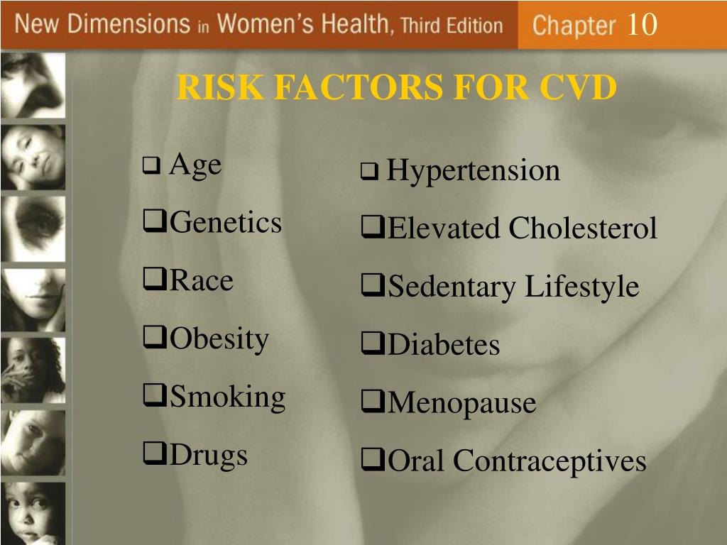 10 RISK FACTORS FOR CVD • Age • Genetics • Race • Obesity • Smoking • Drugs • Hypertension • Elevated Cholesterol • Sedentary Lifestyle • Diabetes • Menopause • Oral Contraceptives