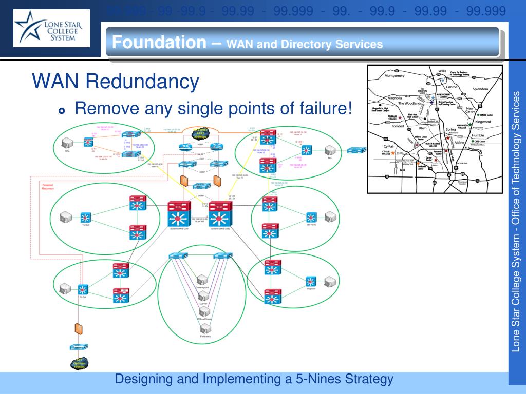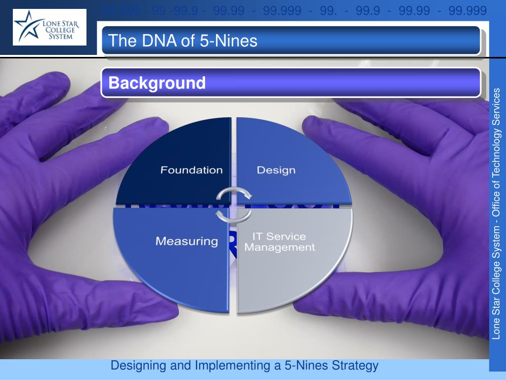 Designing and Implementing a 5-Nines Strategy. Link Alander, Executive Director, Campus Technology Services Shah Ardalan, Vice Chancellor Technology Services / CIO. The DNA of 5-Nines. Background. 10,000 foot Overview. Background. Lone Star College System Over 65,000 students
