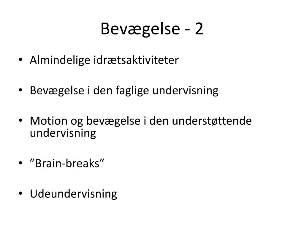 Bevægelse - 2 Almindelige idrætsaktiviteter Bevægelse i den faglige undervisning Motion og bevægelse i den understøttende undervisning ”Brain-breaks” Udeundervisning