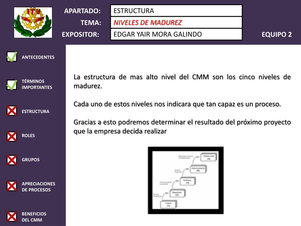APARTADO: ESTRUCTURA TEMA: NIVELES DE MADUREZ EXPOSITOR: EDGAR YAIR MORA GALINDO EQUIPO 2 ANTECEDENTES TÉRMINOS IMPORTANTES ESTRUCTURA ROLES GRUPOS APRECIACIONES DE PROCESOS BENEFICIOS DEL CMM La estructura de mas alto nivel del CMM son los cinco niveles de madurez. Cada uno de estos niveles nos indicara que tan capaz es un proceso. Gracias a esto podremos determinar el resultado del próximo proyecto que la empresa decida realizar