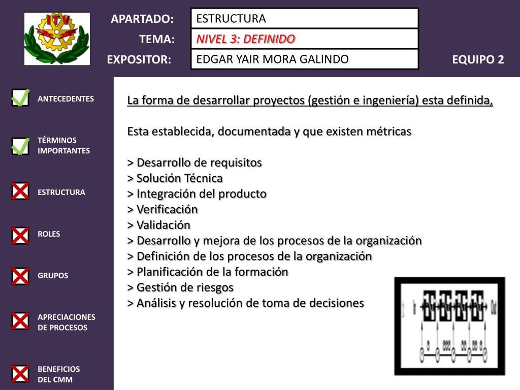 APARTADO: ESTRUCTURA TEMA: NIVEL 3: DEFINIDO EXPOSITOR: EDGAR YAIR MORA GALINDO EQUIPO 2 • La forma de desarrollar proyectos (gestión e ingeniería) esta definida, • Esta establecida, documentada y que existen métricas • > Desarrollo de requisitos • > Solución Técnica • > Integración del producto • > Verificación • > Validación • > Desarrollo y mejora de los procesos de la organización • > Definición de los procesos de la organización • > Planificación de la formación • > Gestión de riesgos • > Análisis y resolución de toma de decisiones ANTECEDENTES TÉRMINOS IMPORTANTES ESTRUCTURA ROLES GRUPOS APRECIACIONES DE PROCESOS BENEFICIOS DEL CMM