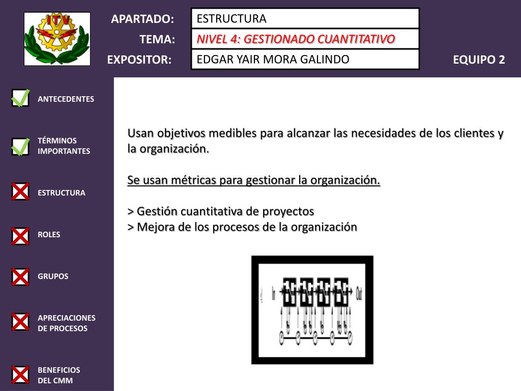 APARTADO: ESTRUCTURA TEMA: NIVEL 4: GESTIONADO CUANTITATIVO EXPOSITOR: EDGAR YAIR MORA GALINDO EQUIPO 2 ANTECEDENTES TÉRMINOS IMPORTANTES ESTRUCTURA ROLES GRUPOS APRECIACIONES DE PROCESOS BENEFICIOS DEL CMM • Usan objetivos medibles para alcanzar las necesidades de los clientes y la organización. • Se usan métricas para gestionar la organización. • > Gestión cuantitativa de proyectos • > Mejora de los procesos de la organización