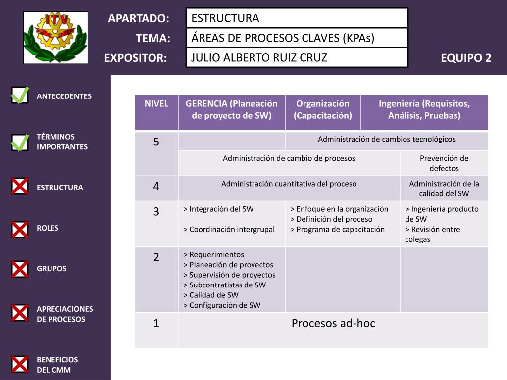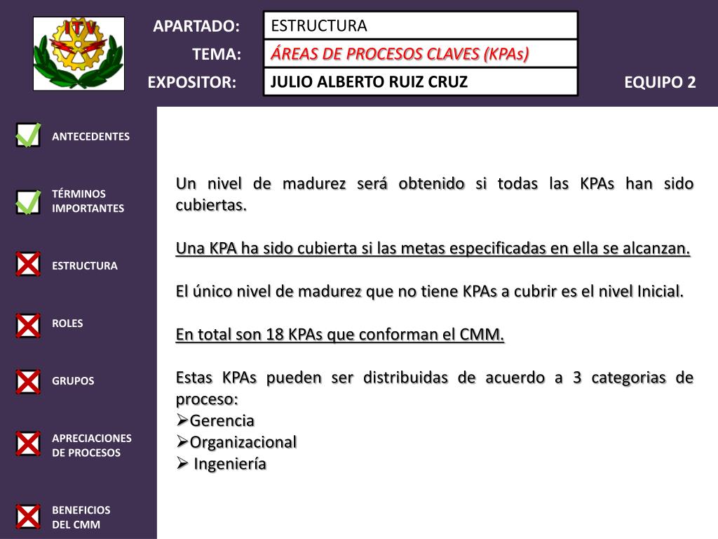 APARTADO: ESTRUCTURA TEMA: ÁREAS DE PROCESOS CLAVES (KPAs) EXPOSITOR: JULIO ALBERTO RUIZ CRUZ EQUIPO 2 ANTECEDENTES TÉRMINOS IMPORTANTES ESTRUCTURA ROLES GRUPOS APRECIACIONES DE PROCESOS BENEFICIOS DEL CMM