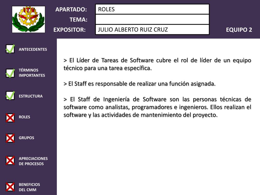 APARTADO: ROLES TEMA: EXPOSITOR: JULIO ALBERTO RUIZ CRUZ EQUIPO 2 ANTECEDENTES TÉRMINOS IMPORTANTES ESTRUCTURA ROLES GRUPOS APRECIACIONES DE PROCESOS BENEFICIOS DEL CMM • > El Líder de Tareas de Software cubre el rol de líder de un equipo técnico para una tarea específica. • > El Staff es responsable de realizar una función asignada. • > El Staff de Ingeniería de Software son las personas técnicas de software como analistas, programadores e ingenieros. Ellos realizan el software y las actividades de mantenimiento del proyecto.
