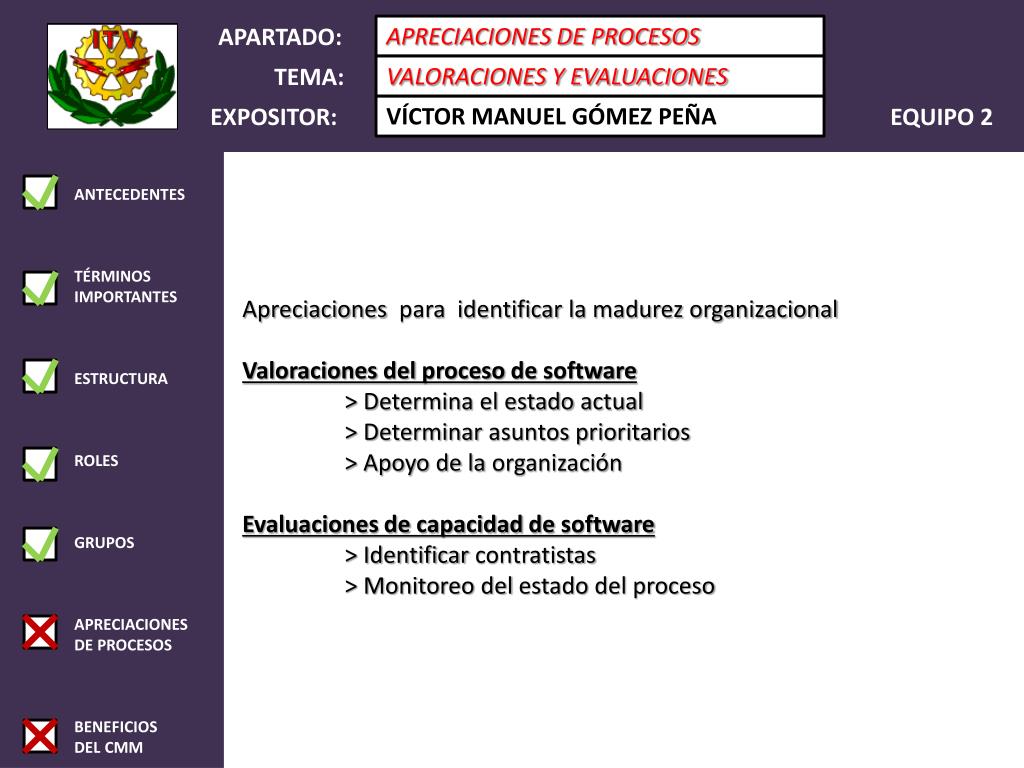 APARTADO: APRECIACIONES DE PROCESOS TEMA: VALORACIONES Y EVALUACIONES EXPOSITOR: VÍCTOR MANUEL GÓMEZ PEÑA EQUIPO 2 ANTECEDENTES TÉRMINOS IMPORTANTES ESTRUCTURA ROLES GRUPOS APRECIACIONES DE PROCESOS BENEFICIOS DEL CMM • Apreciaciones para identificar la madurez organizacional • Valoraciones del proceso de software • > Determina el estado actual • > Determinar asuntos prioritarios • > Apoyo de la organización • Evaluaciones de capacidad de software • > Identificar contratistas • > Monitoreo del estado del proceso