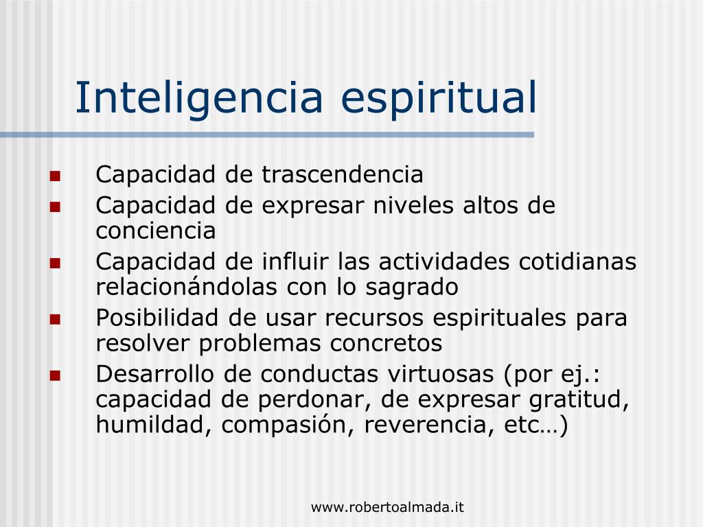 Inteligencia espiritual • Capacidad de trascendencia • Capacidad de expresarnivelesaltos de conciencia • Capacidad de influirlasactividadescotidianasrelacionándolas con losagrado • Posibilidad de usarrecursosespirituales para resolverproblemasconcretos • Desarrollo de conductasvirtuosas (por ej.: capacidad de perdonar, deexpresargratitud, humildad, compasión, reverencia, etc…) www.robertoalmada.it