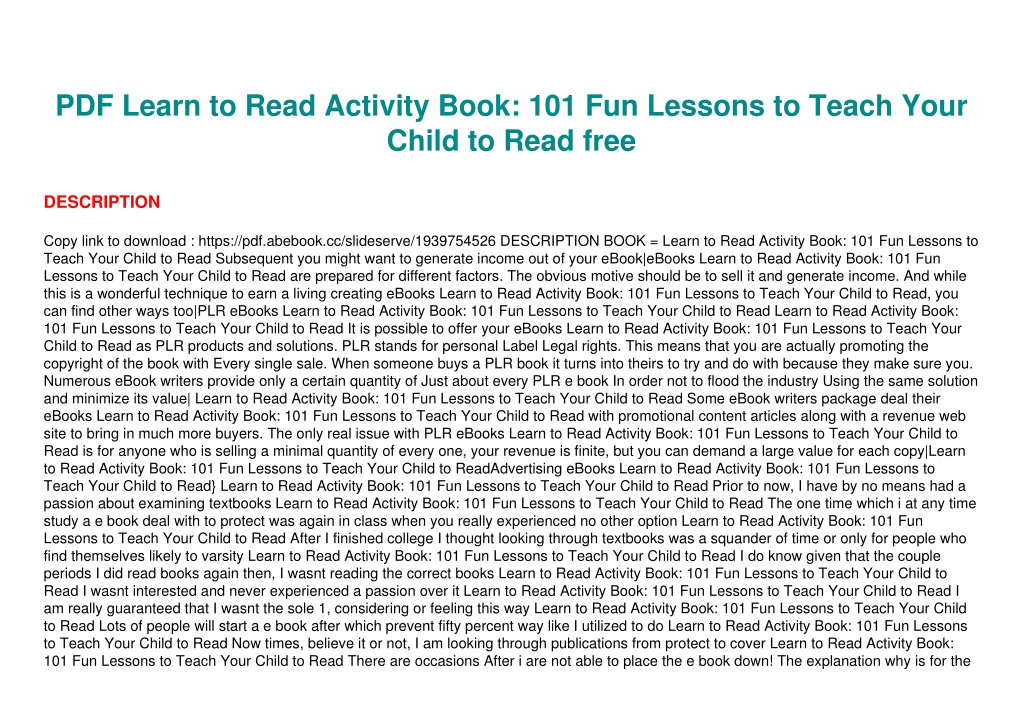 PDF Learn to Read Activity Book: 101 Fun Lessons to Teach Your Child to Read free DESCRIPTION Copy link to download : https://pdf.abebook.cc/slideserve/1939754526 DESCRIPTION BOOK = Learn to Read Activity Book: 101 Fun Lessons to Teach Your Child to Read Subsequent you might want to generate income out of your eBook|eBooks Learn to Read Activity Book: 101 Fun Lessons to Teach Your Child to Read are prepared for different factors. The obvious motive should be to sell it and generate income. And while this is a wonderful technique to earn a living creating eBooks Learn to Read Activity Book: 101 Fun Lessons to Teach Your Child to Read, you can find other ways too|PLR eBooks Learn to Read Activity Book: 101 Fun Lessons to Teach Your Child to Read Learn to Read Activity Book: 101 Fun Lessons to Teach Your Child to Read It is possible to offer your eBooks Learn to Read Activity Book: 101 Fun Lessons to Teach Your Child to Read as PLR products and solutions. PLR stands for personal Label Legal rights. This means that you are actually promoting the copyright of the book with Every single sale. When someone buys a PLR book it turns into theirs to try and do with because they make sure you. Numerous eBook writers provide only a certain quantity of Just about every PLR e book In order not to flood the industry Using the same solution and minimize its value| Learn to Read Activity Book: 101 Fun Lessons to Teach Your Child to Read Some eBook writers package deal their eBooks Learn to Read Activity Book: 101 Fun Lessons to Teach Your Child to Read with promotional content articles along with a revenue web site to bring in much more buyers. The only real issue with PLR eBooks Learn to Read Activity Book: 101 Fun Lessons to Teach Your Child to Read is for anyone who is selling a minimal quantity of every one, your revenue is finite, but you can demand a large value for each copy|Learn to Read Activity Book: 101 Fun Lessons to Teach Your Child to ReadAdvertising eBooks Learn to Read Activity Book: 101 Fun Lessons to Teach Your Child to Read} Learn to Read Activity Book: 101 Fun Lessons to Teach Your Child to Read Prior to now, I have by no means had a passion about examining textbooks Learn to Read Activity Book: 101 Fun Lessons to Teach Your Child to Read The one time which i at any time study a e book deal with to protect was again in class when you really experienced no other option Learn to Read Activity Book: 101 Fun Lessons to Teach Your Child to Read After I finished college I thought looking through textbooks was a squander of time or only for people who find themselves likely to varsity Learn to Read Activity Book: 101 Fun Lessons to Teach Your Child to Read I do know given that the couple periods I did read books again then, I wasnt reading the correct books Learn to Read Activity Book: 101 Fun Lessons to Teach Your Child to Read I wasnt interested and never experienced a passion over it Learn to Read Activity Book: 101 Fun Lessons to Teach Your Child to Read I am really guaranteed that I wasnt the sole 1, considering or feeling this way Learn to Read Activity Book: 101 Fun Lessons to Teach Your Child to Read Lots of people will start a e book after which prevent fifty percent way like I utilized to do Learn to Read Activity Book: 101 Fun Lessons to Teach Your Child to Read Now times, believe it or not, I am looking through publications from protect to cover Learn to Read Activity Book: 101 Fun Lessons to Teach Your Child to Read There are occasions After i are not able to place the e book down! The explanation why is for the