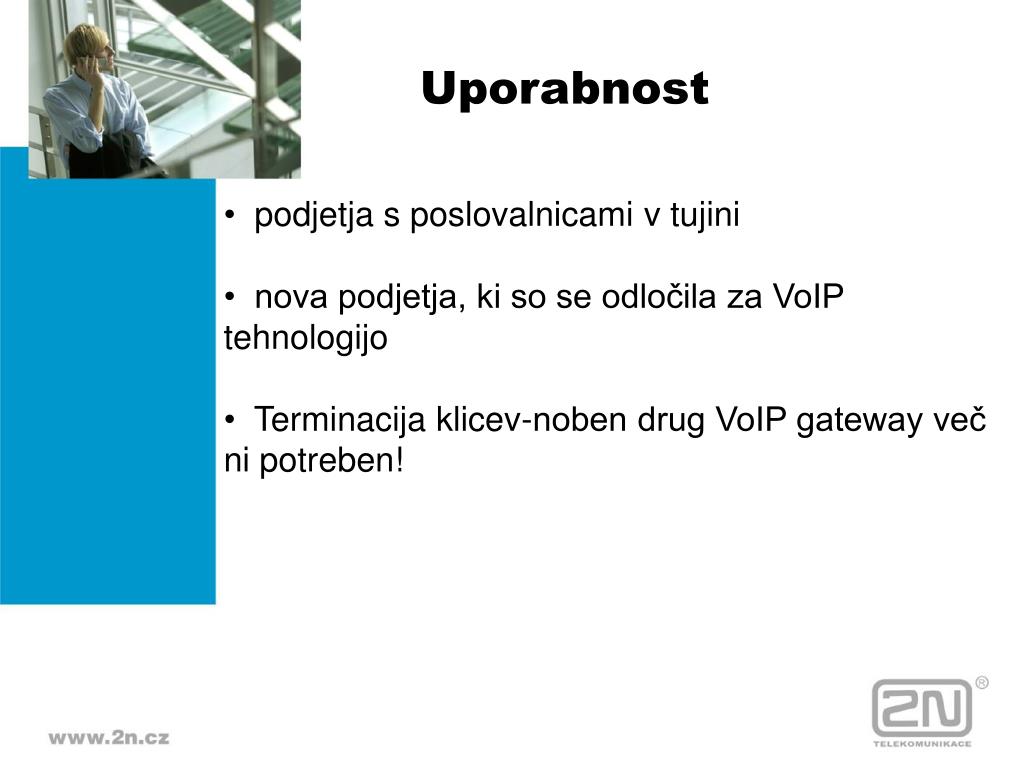 Uporabnost • podjetja s poslovalnicami v tujini • nova podjetja, ki so se odločila za VoIP tehnologijo • Terminacija klicev-noben drug VoIP gateway več ni potreben!