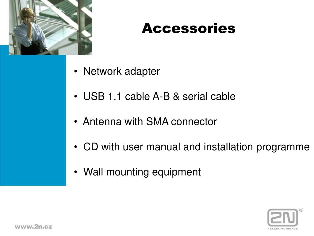 Accessories • Network adapter • USB 1.1 cable A-B & serial cable • Antenna with SMA connector • CD with user manual and installation programme • Wall mounting equipment