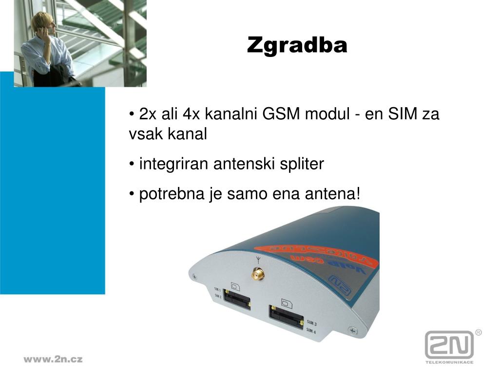 Zgradba • 2x ali 4x kanalni GSM modul - enSIMza vsak kanal • integriran antenski spliter • potrebna je samo ena antena!
