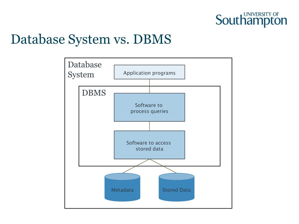 Database System vs. DBMS DatabaseSystem Application programs DBMS Software to process queries Software to access stored data Metadata Stored Data