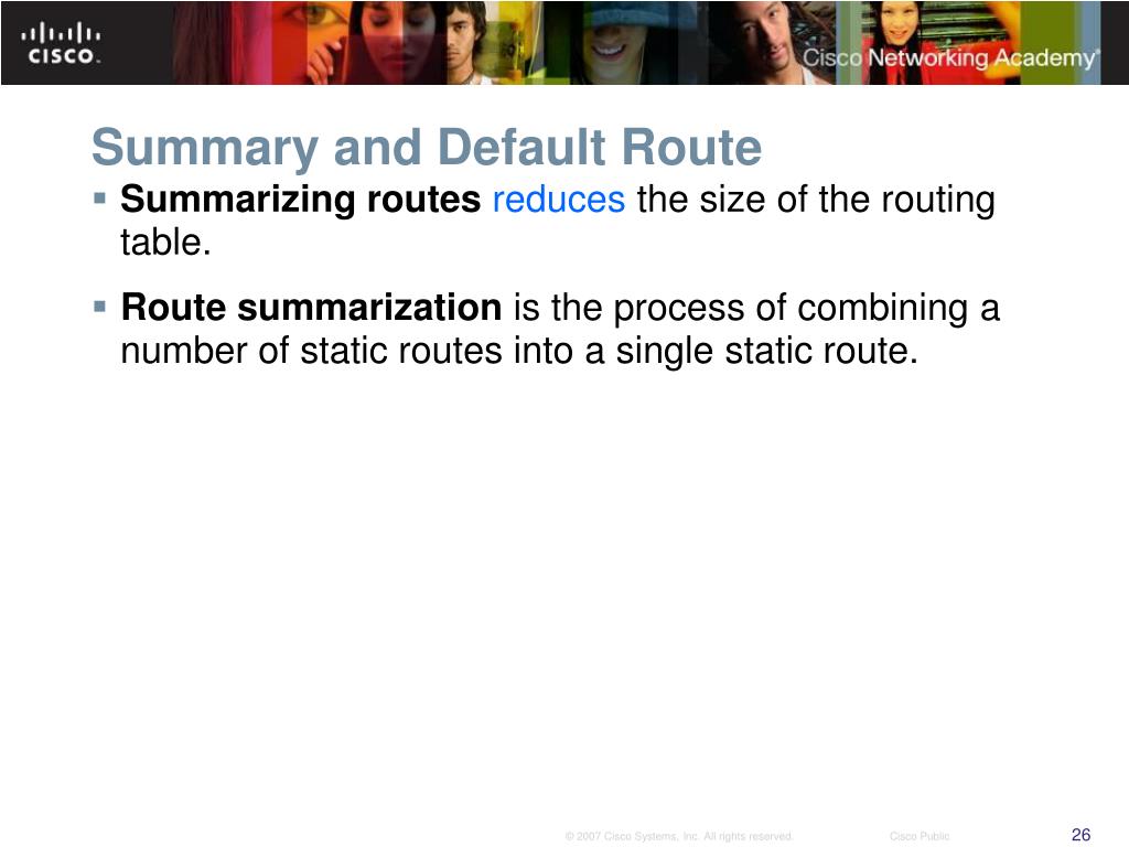 Summary and Default Route • Summarizing routesreduces the size of the routing table. • Route summarization is the process of combining a number of static routes into a single static route.