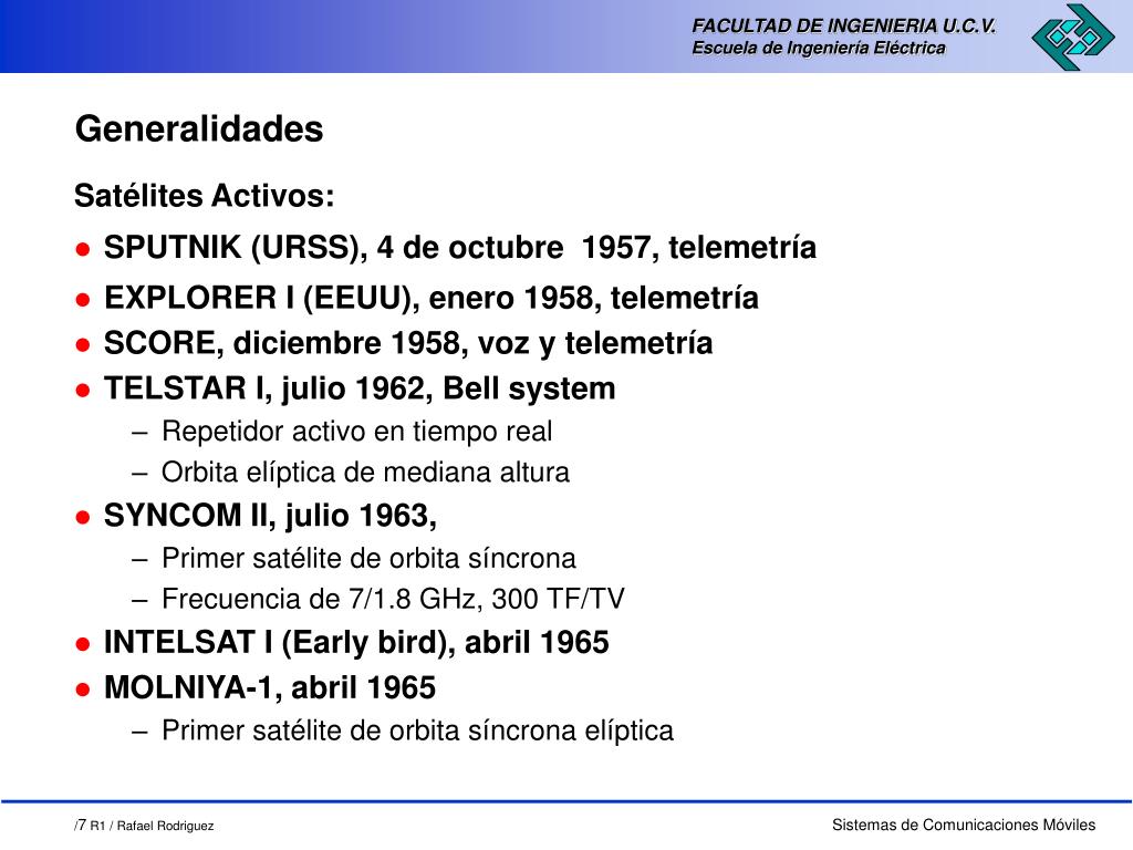 Generalidades Satélites Activos: • SPUTNIK (URSS), 4 de octubre 1957, telemetría • EXPLORER I (EEUU), enero 1958, telemetría • SCORE, diciembre 1958, voz y telemetría • TELSTAR I, julio 1962, Bell system • Repetidor activo en tiempo real • Orbita elíptica de mediana altura • SYNCOM II, julio 1963, • Primer satélite de orbita síncrona • Frecuencia de 7/1.8 GHz, 300 TF/TV • INTELSAT I (Early bird), abril 1965 • MOLNIYA-1, abril 1965 • Primer satélite de orbita síncrona elíptica