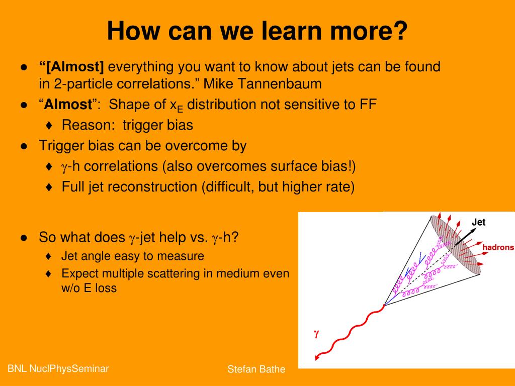 How can we learn more? • “[Almost] everything you want to know about jets can be found in 2-particle correlations.” Mike Tannenbaum • “Almost”: Shape of xE distribution not sensitive to FF • Reason: trigger bias • Trigger bias can be overcome by • g-h correlations (also overcomes surface bias!) • Full jet reconstruction (difficult, but higher rate) • So what does g-jet help vs. g-h? • Jet angle easy to measure • Expect multiple scattering in medium even w/o E loss Stefan Bathe