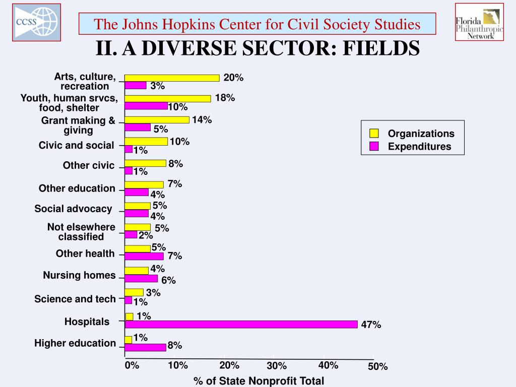Organizations Expenditures II. A DIVERSE SECTOR: FIELDS The Johns Hopkins Center for Civil Society Studies 20% Arts, culture, recreation 3% 18% Youth, human srvcs, food, shelter 10% 14% Grant making & giving 5% 10% Civic and social 1% 8% Other civic 1% 7% Other education 4% 5% Social advocacy 4% 5% Not elsewhere classified 2% 5% 7% Other health 4% Nursing homes 6% 3% Science and tech 1% 1% Hospitals 47% 1% 8% Higher education 0% 10% 20% 40% 30% 50% % of State Nonprofit Total
