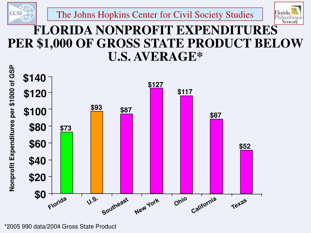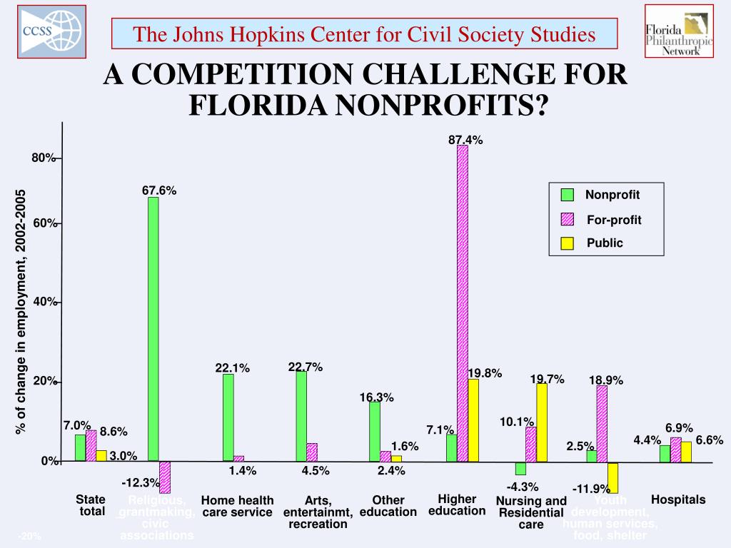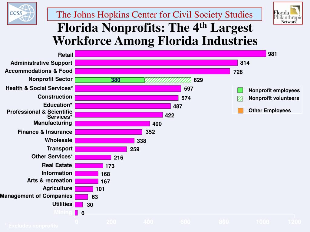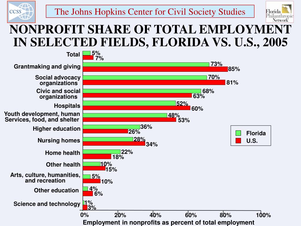 FLORIDA’S NONPROFIT SECTOR:. A MAJOR ECONOMIC FORCE. Lester M. Salamon. Miami, Florida, November 7, 2007. The Johns Hopkins Center for Civil Society Studies. FLORIDA REALITIES. • 4 th most populous state. • Twice the U.S. population growth rate, 2000-04.