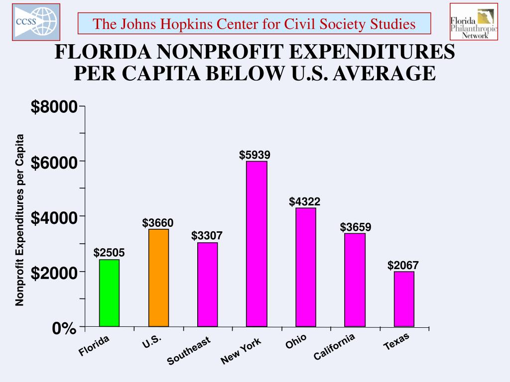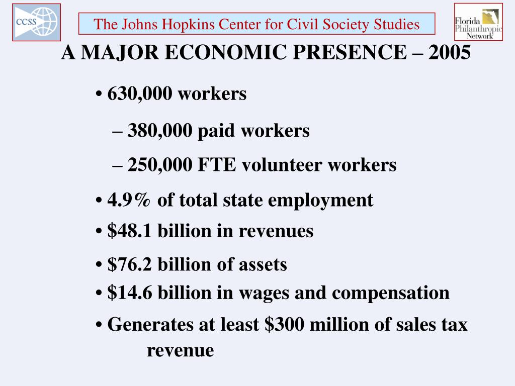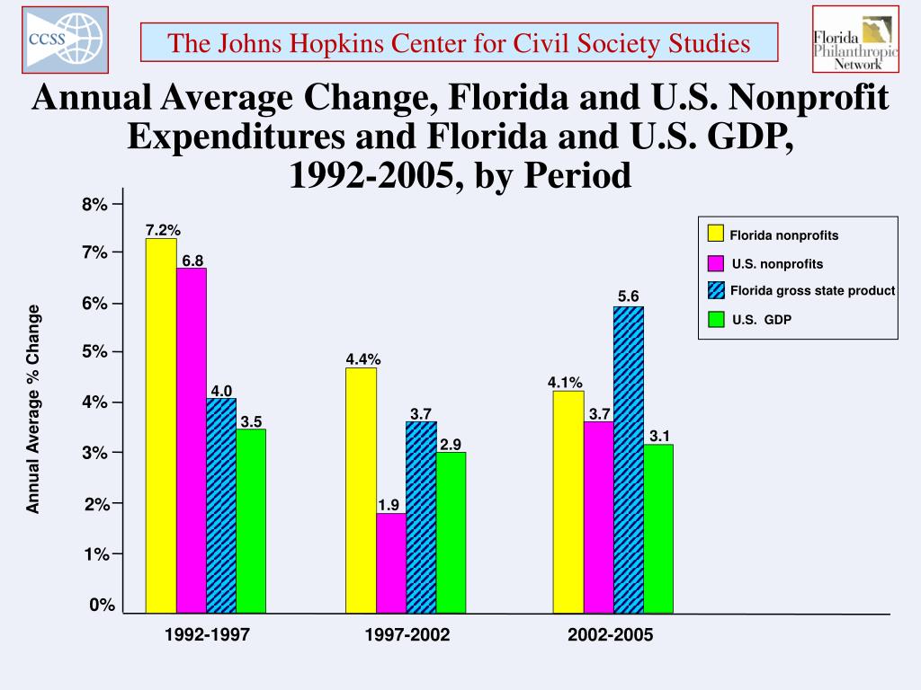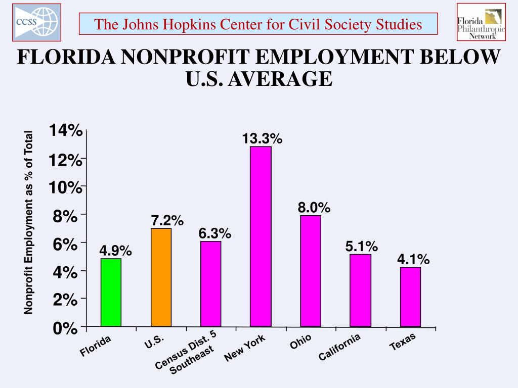 FLORIDA’S NONPROFIT SECTOR:. A MAJOR ECONOMIC FORCE. Lester M. Salamon. Miami, Florida, November 7, 2007. The Johns Hopkins Center for Civil Society Studies. FLORIDA REALITIES. • 4 th most populous state. • Twice the U.S. population growth rate, 2000-04.