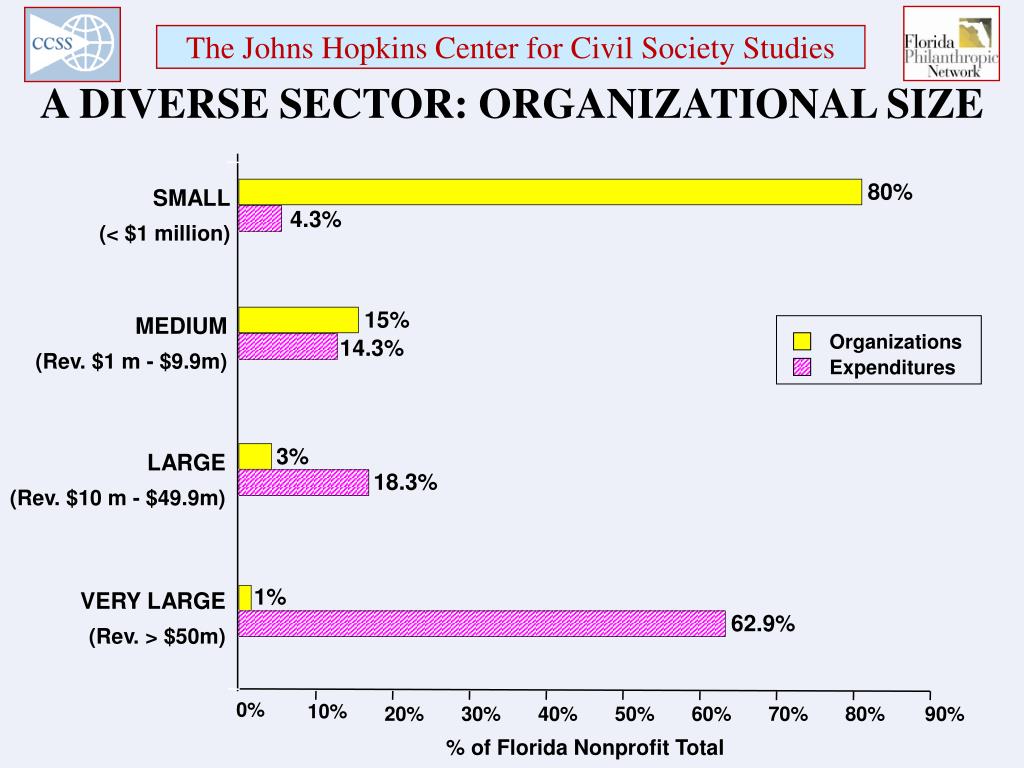Organizations Expenditures A DIVERSE SECTOR: ORGANIZATIONAL SIZE The Johns Hopkins Center for Civil Society Studies 80% SMALL (< $1 million) 4.3% 15% MEDIUM (Rev. $1 m - $9.9m) 14.3% 3% LARGE (Rev. $10 m - $49.9m) 18.3% 1% VERY LARGE (Rev. > $50m) 62.9% 0% 10% 20% 30% 40% 50% 60% 70% 80% 90% % of Florida Nonprofit Total