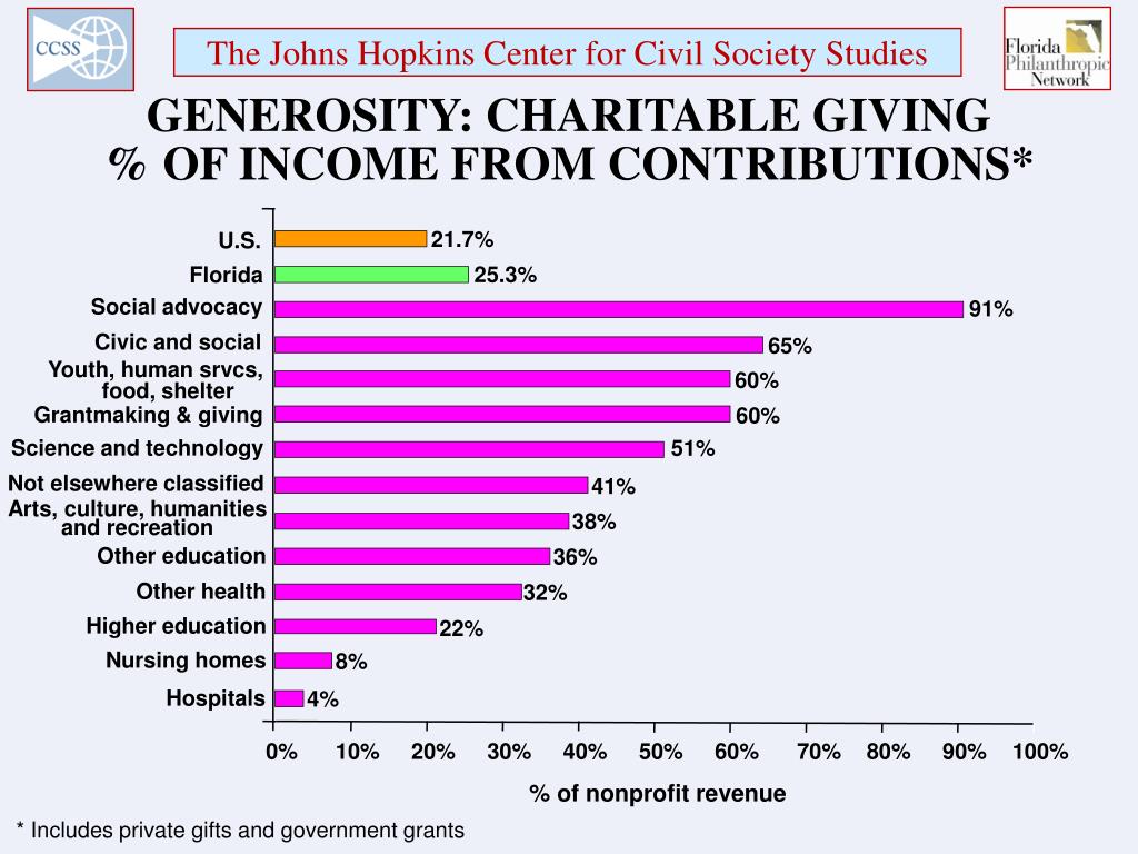 The Johns Hopkins Center for Civil Society Studies GENEROSITY: CHARITABLE GIVING% OF INCOME FROM CONTRIBUTIONS* 21.7% U.S. 25.3% Florida 91% Social advocacy 65% Civic and social Youth, human srvcs, food, shelter 60% 60% Grantmaking & giving 51% Science and technology 41% Not elsewhere classified Arts, culture, humanities and recreation 38% 36% Other education 32% Other health 22% Higher education 8% Nursing homes 4% Hospitals 0% 10% 20% 30% 40% 50% 60% 70% 80% 90% 100% % of nonprofit revenue * Includes private gifts and government grants