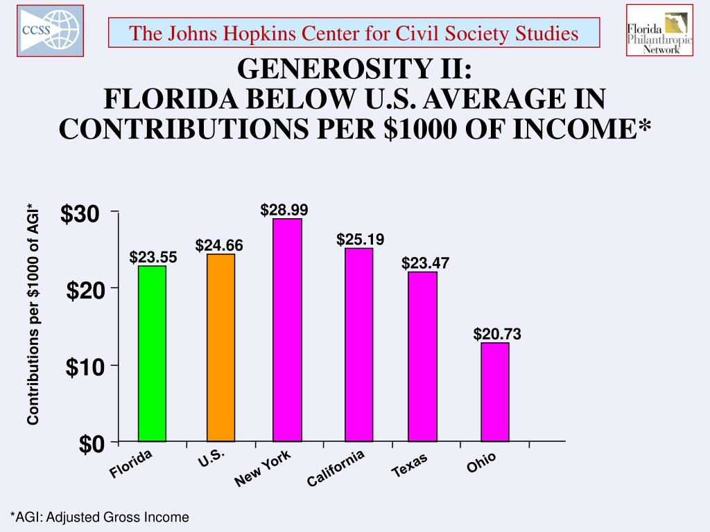 The Johns Hopkins Center for Civil Society Studies GENEROSITY II:FLORIDA BELOW U.S. AVERAGE IN CONTRIBUTIONS PER $1000 OF INCOME* $30 $28.99 $25.19 $24.66 $23.55 $23.47 $20 Contributions per $1000 of AGI* $20.73 $10 $0 U.S. Ohio Florida Texas California New York *AGI: Adjusted Gross Income