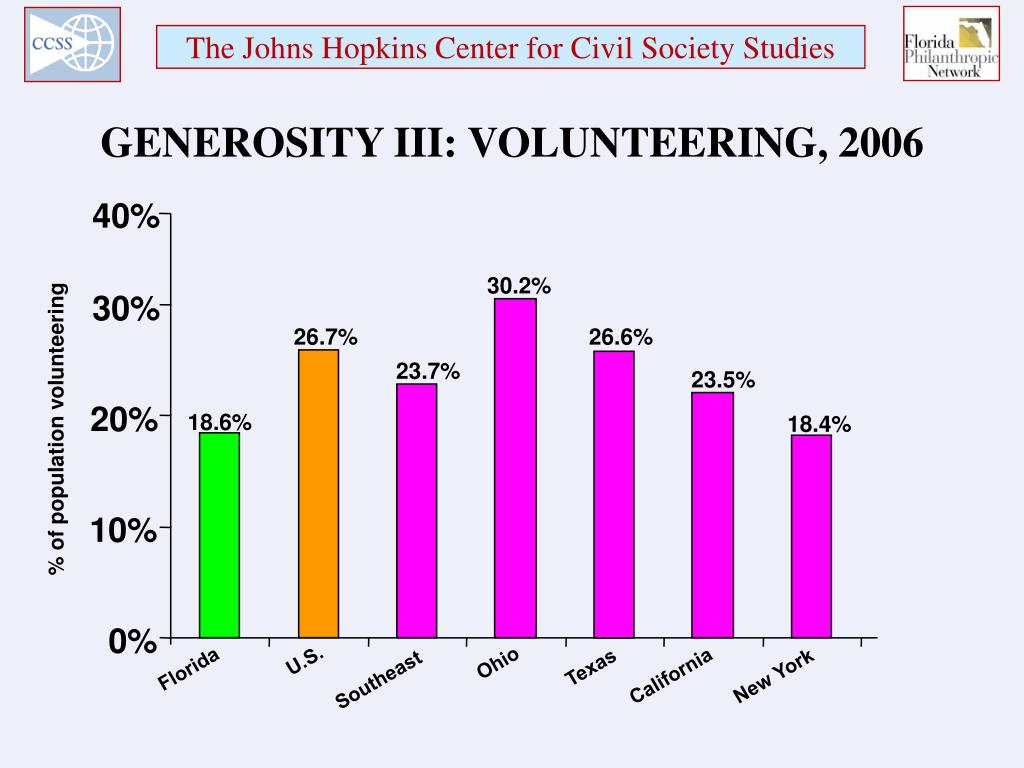 The Johns Hopkins Center for Civil Society Studies GENEROSITY III: VOLUNTEERING, 2006 40% 30.2% 30% 26.7% 26.6% 23.7% 23.5% 20% 18.6% 18.4% % of population volunteering 10% 0% U.S. Ohio Texas Florida California New York Southeast