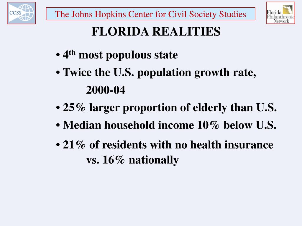 The Johns Hopkins Center for Civil Society Studies FLORIDA REALITIES • 4th most populous state • Twice the U.S. population growth rate, 2000-04 • 25% larger proportion of elderly than U.S. • Median household income 10% below U.S. • 21% of residents with no health insurance vs. 16% nationally