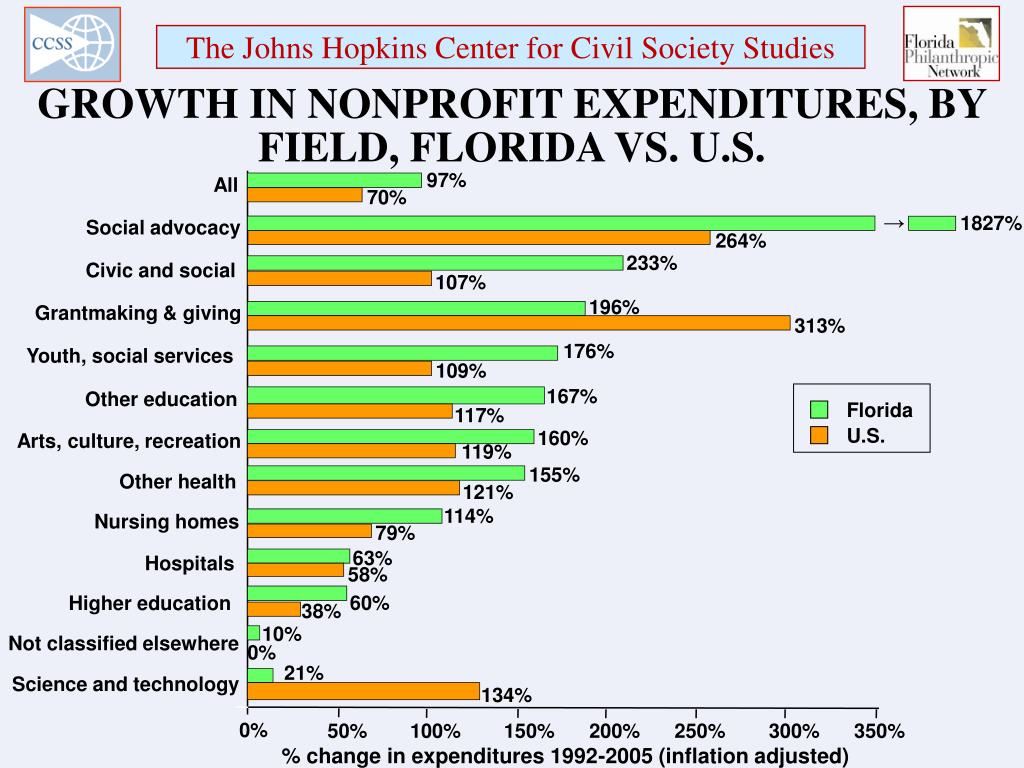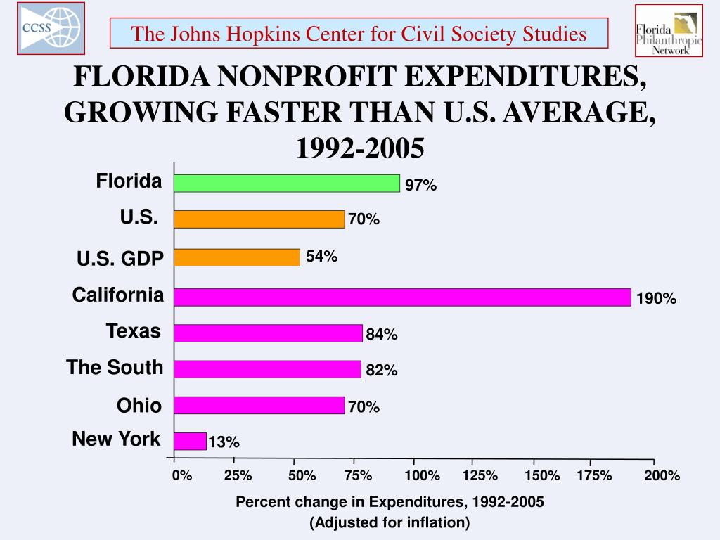 The Johns Hopkins Center for Civil Society Studies FLORIDA NONPROFIT EXPENDITURES, GROWING FASTER THAN U.S. AVERAGE, 1992-2005 Florida 97% 70% U.S. 54% U.S. GDP California 190% Texas 84% 82% The South 70% Ohio 13% New York 0% 25% 75% 125% 175% 50% 100% 150% 200% Percent change in Expenditures, 1992-2005 (Adjusted for inflation)