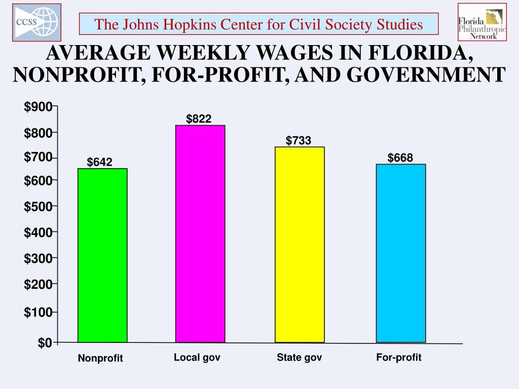 The Johns Hopkins Center for Civil Society Studies AVERAGE WEEKLY WAGES IN FLORIDA,NONPROFIT, FOR-PROFIT, AND GOVERNMENT $900 $822 $800 $733 $700 $668 $642 $600 $500 $400 $300 $200 $100 $0 Local gov State gov For-profit Nonprofit