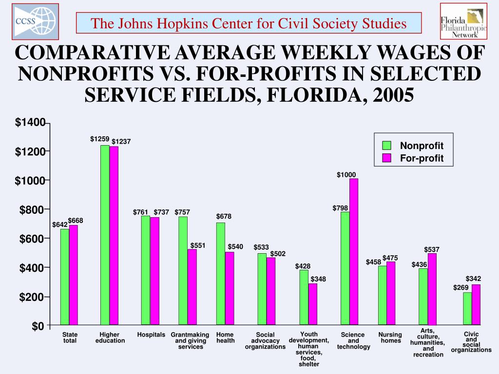Nonprofit For-profit The Johns Hopkins Center for Civil Society Studies COMPARATIVE AVERAGE WEEKLY WAGES OF NONPROFITS VS. FOR-PROFITS IN SELECTED SERVICE FIELDS, FLORIDA, 2005 $1400 $1259 $1237 $1200 $1000 $1000 $798 $800 $761 $737 $757 $678 $668 $642 $600 $551 $540 $533 $537 $502 $475 $458 $436 $428 $400 $342 $348 $269 $200 $0 Arts, culture, humanities, and recreation Youth development, human services, food, shelter State total Higher education Hospitals Grantmaking and giving services Home health Social advocacy organizations Science and technology Nursing homes Civic and social organizations