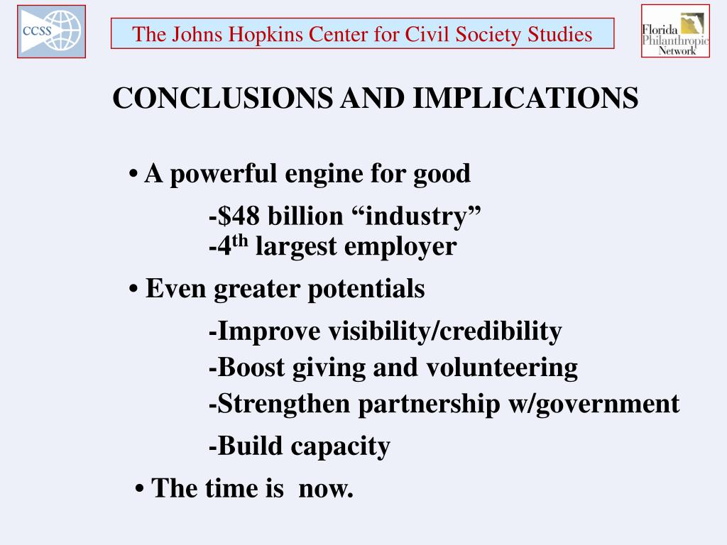 The Johns Hopkins Center for Civil Society Studies CONCLUSIONS AND IMPLICATIONS • A powerful engine for good -$48 billion “industry” -4th largest employer • Even greater potentials -Improve visibility/credibility -Boost giving and volunteering -Strengthen partnership w/government -Build capacity • The time is now.